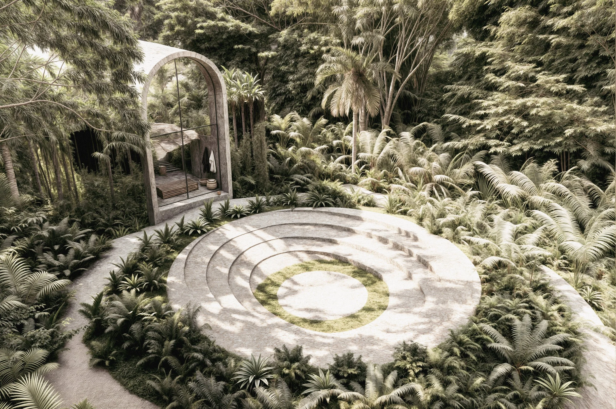 Entering a vortex of vitality and regeneration. Your place to relax and elevate, just a few steps away from your home, designed with the concept of Roman Baths in mind. It features a sauna, steam bath, hot plunge, cold plunge, jacuzzi, massage room, and an area for sound healing.